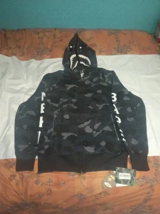 Sudadera con diseño de camuflaje en tonos grises y negros. - Cremallera frontal. - Capucha con estampado de tiburón. - Bolsillos laterales con cremallera. - Inscripción NBHD en manga izquierda. - Inscripción BAPE en manga derecha.