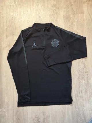 Sudadera deportiva Jordan x PSG en color negro. Presenta un diseño moderno con detalles en las mangas y un cierre de cremallera parcial en el cuello. - Logo de Jordan bordado en el pecho. - Escudo del Paris Saint-Germain en el pecho. - Cremallera frontal hasta medio cuello. - Puños elásticos en las mangas. En perfecto estado tal y como se ve en las fotos. 📨 Envíos en 24h laborables 📏 Medidas en las fotos 📦 Perfectamente empaquetado