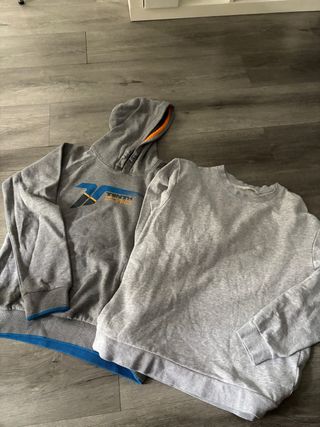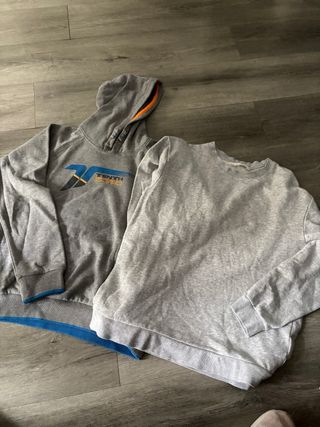 Conjunto de dos sudaderas cómodas y versátiles. - Una sudadera con capucha y detalles en naranja y azul. - Otra sudadera tipo jersey con cuello redondo. - Ambas prendas son de tejido suave y agradable al tacto. - Talla real 13/14 años