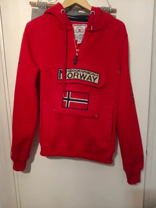 Sudadera con capucha de Geographical Norway. - Color rojo vibrante. - Diseño con media cremallera. - Bolsillo frontal tipo canguro. - Detalle de la bandera de Noruega. - Logo de la marca en el pecho.