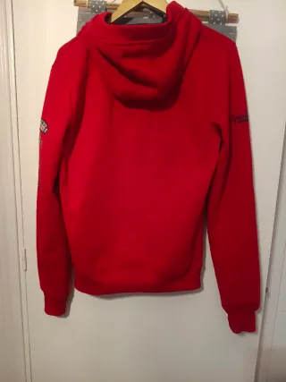 Sudadera con capucha para hombre, talla L, color roja. Está como nueva, se ha puesto en muy pocas ocasiones, tiene una pequeña mancha en la cara interior de una de las mangas, inapreciable. - Diseño con estampado circular en el pecho. - Cordones ajustables en la capucha. - Bolsillo tipo canguro.