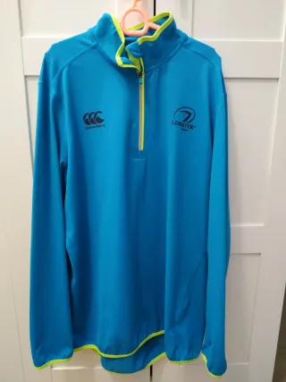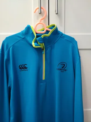 Sudadera deportiva Canterbury con diseño de media cremallera. - Color azul vibrante con detalles en verde lima. - Logo de Canterbury en el pecho. - Escudo de Leinster Rugby en el otro lado del pecho.