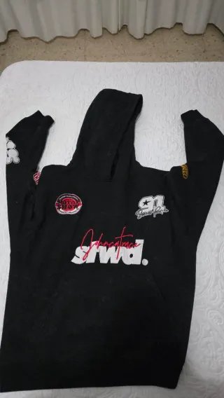 Sudadera con capucha y diseño estampado. - Estampado frontal con logo y texto. - Parches decorativos en mangas y pecho. - Capucha con cordones. - Bolsillo canguro.