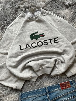 Sudadera gris con el icónico logo de Lacoste. - Logo de cocodrilo en color verde. - Nombre de la marca en negro.