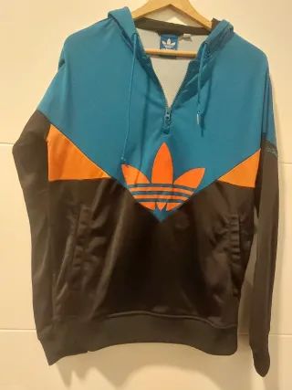 -Sudadera con capucha y media cremallera de Adidas. -Sudadera con cremallera Adidas - Diseño con bloques de color. - Logo grande en el pecho. - Bolsillos frontales.