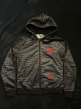 Sudadera con un llamativo estampado de cebra. - Diseño con capucha. - Cierre de cremallera frontal. - Logo de Adidas y detalle 'Chile 62' en rojo.