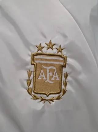 Sudadera Argentina blanca con detalles celestes y dorados. - Logo de Adidas en dorado. - Escudo de la AFA con estrellas bordado. - Cremallera completa. - Bolsillos laterales con cremallera. - Puños y cintura elásticos.
