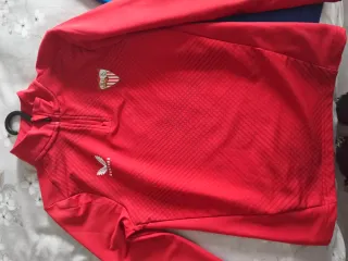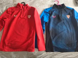 Dos sudaderas del Sevilla FC, una en color rojo y otra en azul. Ambas son de la marca Castore y cuentan con un diseño moderno. - 20€ cada una - Sudadera roja con detalles texturizados. - Sudadera azul con diseño de líneas. - Cremallera corta en el cuello. - Escudo del club en el pecho.