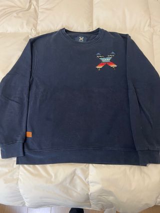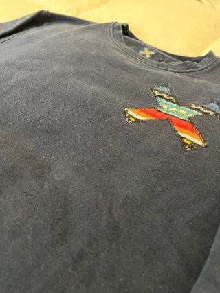Sudadera original de la marca Blue Banana Brand en color azul grisáceo. Prenda de alta calidad con el icónico logotipo de la "X" bordado con patrón étnico en el pecho y en la espalda. Marca: Blue Banana Brand. Talla: XL. Estado: Muy buen estado de conservación, mínimo signos de desgaste en el logo trasero. Detalles: Logotipo bordado en relieve y etiqueta de cuero original en el bajo lateral. Envío: Preparación inmediata y envío en menos de 48 horas. #bluebanana #sudaderahombre #vintage #streetwear #casual #ethnic