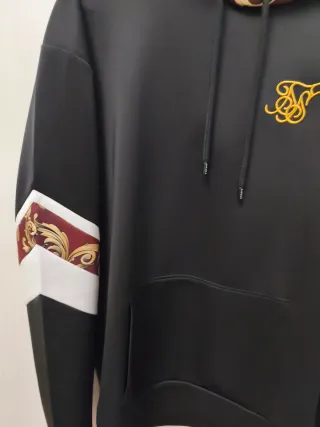 Sudadera con capucha de la marca SikSilk. Diseño en color negro con detalles estampados en mangas y capucha. Logo de la marca bordado en la parte frontal. Talla S de hombre.