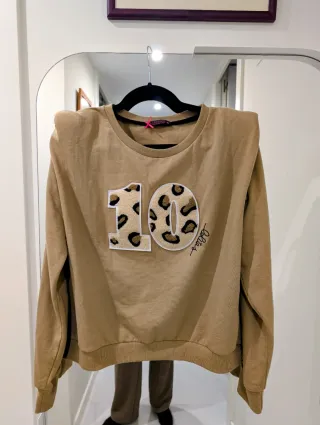 Sudadera de manga larga con un diseño original. - Cuello redondo. - Estampado frontal con detalles de leopardo. - Puños y bajo acanalados. Tiene hombreras. Interior muy cálido. 43 cm de hombros. 58 cm de pecho. 56 cm de largo. Poco usada.
