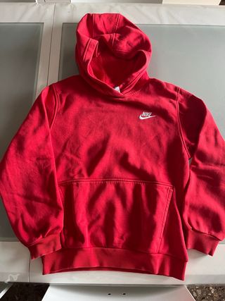 Talla L DE NIÑO 147-148 CM ORIGINAL Sudadera con capucha de la marca Nike en color rojo. Presenta un diseño clásico con bolsillo canguro. - Logo de Nike bordado en el pecho. - Puños y bajo elásticos.