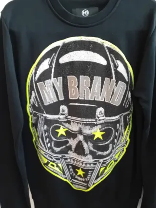 Sudadera con un llamativo diseño frontal. - Estampado de calavera con casco. - Detalles de estrellas amarillas. - Acabado con pedrería y ribete neón.