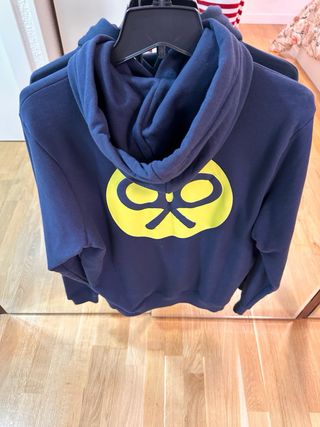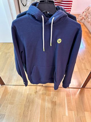 Sudadera con capucha de la marca Silbon. - Color azul marino. - Cordones blancos con detalles amarillos. - Logo de la marca en el pecho. - Bolsillo tipo canguro. Usada en dos ocasiones