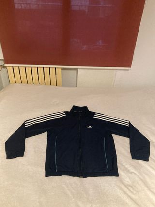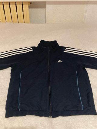 Chaqueta deportiva Adidas de color azul marino. Presenta un diseño clásico con las tres rayas blancas en las mangas y un pequeño logo de la marca en el pecho. - Cierre de cremallera frontal. - Cuello alto. - Puños y cintura elásticos. - Precio negociable.