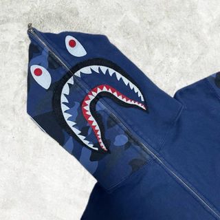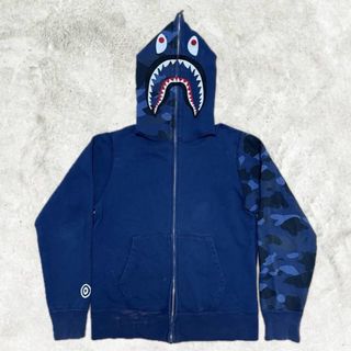 Sudadera con capucha BAPE con el icónico diseño de tiburón y camuflaje. Buen estado general, único detalle una mancha en la parte baja de la sudadera (última foto), talla S eur - Cremallera completa. - Bolsillo frontal.