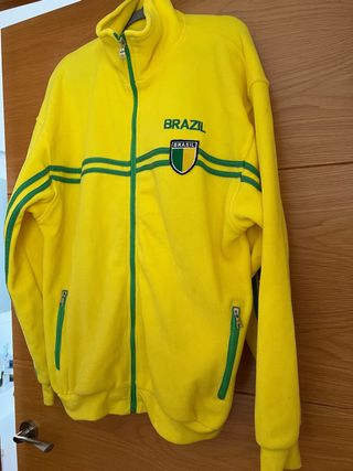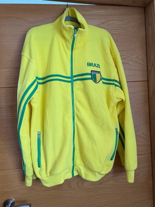Forro polar con diseño inspirado en Brasil, talla XL. Es una prenda cómoda y ligera. - Cremallera frontal completa. - Dos bolsillos laterales con cremallera. - Detalle de rayas verdes en mangas y pecho. - Escudo de Brasil bordado en el pecho.