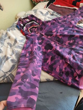 Sudadera con capucha y cremallera completa de BAPE con un llamativo estampado de camuflaje. - Diseño de camuflaje en tonos morados y rosas. - Capucha con detalle de tiburón. - Cremallera frontal.
