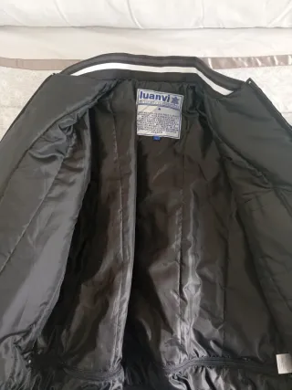 Chaqueta negra de la marca Luanvi. Diseño moderno con detalles en blanco. Conserva la etiqueta original ya que nunca se ha usado - Cuello redondo con ribetes. - Puños y cintura elásticos con rayas blancas. - Cierre de cremallera frontal. - Parche decorativo en el pecho.