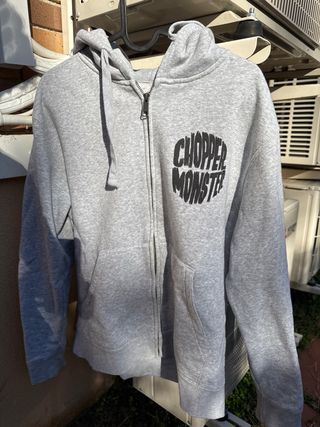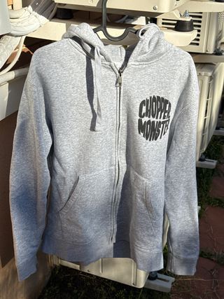 Poco usada. Sudadera con capucha y cremallera de la marca ChopperMonster. Original de la tienda en Madrid, Malasaña, Tribunal. - Capucha con cordones. - Cremallera frontal. - Bolsillos delanteros. -Dibujo por detras