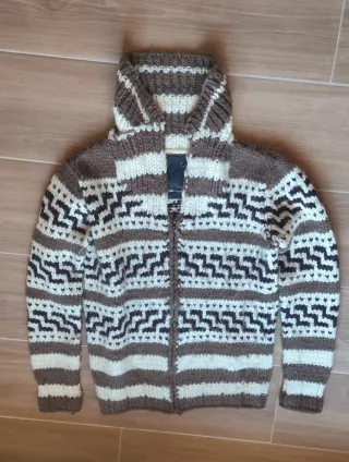 Chaqueta de lana con un diseño de rayas y patrones geométricos. - Cierre completo con cremallera. -. - Tejido de lana grueso.