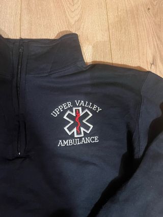 Sudadera negra tipo 1/4 zip (half zip) con bordado “Upper Valley Ambulance” en el pecho. Estilo workwear americano / vintage, muy cómoda y calentita. Cremallera en el cuello y bolsillos frontales. Prenda en buen estado general. 📦 Envíos rápidos y bien protegidos. Ideal para outfits urbanos, streetwear o estilo Y2K.