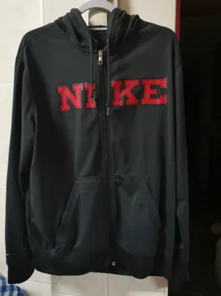 Chaqueta deportiva Nike con un diseño moderno y llamativo. - Color principal negro. - Logo de Nike en color rojo. - Cierre completo con cremallera. - Bolsillos frontales tipo canguro.