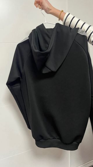 Chaqueta con diseño moderno y detalles llamativos. - Cremallera frontal completa. - Mangas con detalles de rayas y material brillante. - Bolsillos laterales con ribete en contraste. - Le falta el enganche de la cremallera, cierra y abre perfectamente