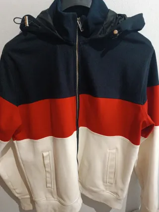 Sudadera deportiva con detalles en contraste. - Cremallera frontal completa. - Bolsillos laterales con cremallera. - Puños y cintura elásticos. - Raya lateral en blanco. - Logotipo con defecto, incluye foto.