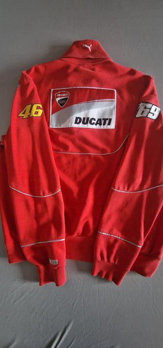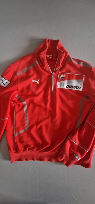 Sudadera deportiva con diseño inspirado en Ducati. - Color rojo con detalles en blanco y gris. - Logo de Puma y escudo de Ducati todo bordado - Cuello alto con media cremallera. - Puños y cintura elásticos.