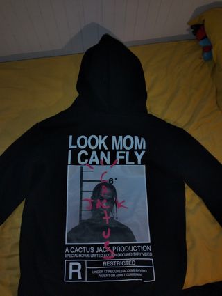 Sudadera con capucha negra de Travis Scott. Está en muy buen estado. - Diseño Cactus Jack en la parte delantera. - Estampado "Look Mom I Can Fly" en la espalda. - Talla S