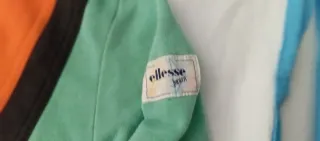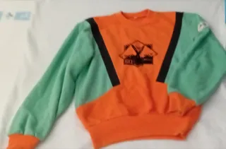 Sudadera vintage de la marca Ellesse, edición especial de esquí de los años 80. Un diseño retro y llamativo. - Mangas en color verde menta. - Cuerpo principal en naranja vibrante. - Detalles en negro. - Estampado central de montaña y esquí.