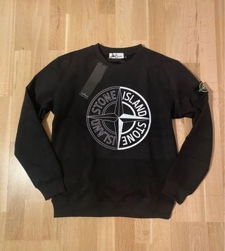 Sudadera negra de cuello redondo con llamativo gráfico circular tipo brújula en contraste blanco en el pecho. Diseño limpio y actual, ideal para un estilo urbano y minimalista. Fabricada en tejido grueso y confortable, ofrece un tacto suave y una estructura sólida que mantiene bien la forma. Cuenta con cuello, puños y cintura acanalados para un ajuste cómodo, además de un parche decorativo en la manga que añade un detalle distintivo y moderno. Fácil de combinar con todo tipo de pantalones y zapatillas, es una prenda versátil perfecta para el día a día. En muy buen estado, ideal para quienes buscan una sudadera de calidad con persona