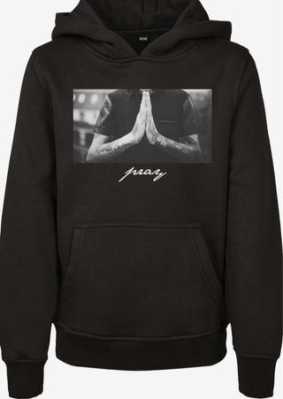 Sudadera con capucha y bolsillo frontal. Presenta un diseño gráfico de manos rezando con la palabra pray escrita. - Estampado frontal. - Capucha ajustable con cordones. - Bolsillo tipo canguro.