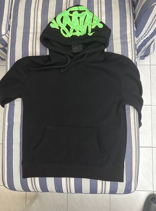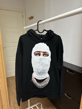 Sudadera negra con un llamativo estampado en la parte delantera. - Diseño gráfico de un rostro cubierto con pasamontañas blanco y cadena dorada. - Capucha. - Bolsillo frontal. - Tengo mas tallas hablame para más información