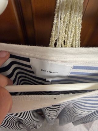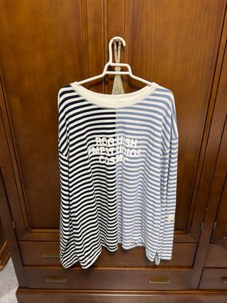 Sudadera de Eme Studios con un diseño de rayas dividido. - Mitad de la prenda en rayas negras y blancas. - Mitad de la prenda en rayas azul claro y blanco. - Cuello redondo. - Manga larga.