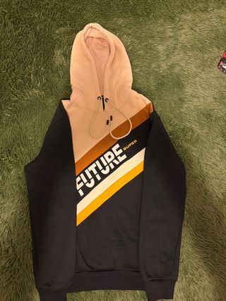 Sudadera con capucha de Enjoy Jeans, con un diseño moderno y llamativo. - Paneles de color beige y negro. - Detalle de rayas diagonales en tonos marrón, blanco y amarillo. - Estampado FUTURE SUPER en el frontal.