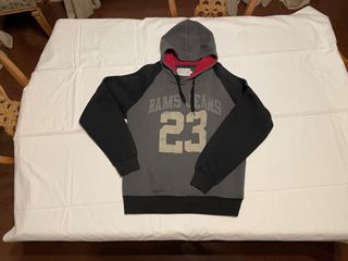Sudadera con capucha de la marca Pepe Jeans. - Talla S - Color Gris - Diseño raglán con mangas negras. - Estampado frontal RAMS JEANS 23. - Interior de la capucha en color rojo.