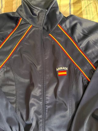 Chaqueta deportiva de la Armada Española, con detalles en rojo y amarillo. - Diseño con cuello alto. - Cierre de cremallera. - Bolsillos laterales. - Insignia de la Armada bordada.