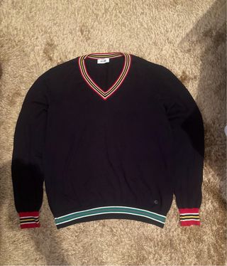 Jersey de cuello pico con detalles de rayas en cuello y puños. - Diseño en color negro. - Ribetes de rayas rojas, amarillas y blancas en el cuello. - Puños con rayas rojas, amarillas, blancas y verdes.