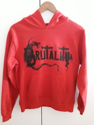 Bonita sudadera color rojo con capucha forrada, con rótulo de una conocida banda estadounidense de death metal. Usada pero en buen estado. Talla S/M según te guste de ajustada. Medidas de hombro, sisa, cintura y brazo en fotos