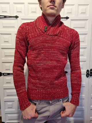 Suéter de punto de canalé de Springfield para hombre, color rojo y talla XXL. Es de manga larga y luce un diseño de trenza en las mangas. Está en muy buen estado. - Diseño de punto de canalé. - Manga larga. - Diseño trenzado en las mangas.