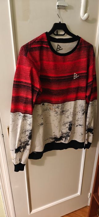 Sudadera con un diseño de rayas horizontales en la parte superior y un efecto desgastado en la parte inferior. - Diseño de rayas rojas y negras. - Parte inferior con estampado blanco y negro. - Logo de la marca en la manga.