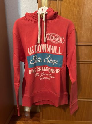 Sudadera con capucha, cremallera y bolsillos, forrada. Talla 16 años (ver medidas en fotografías). Color rojo pálido, en las fotos se ve más vivo de lo que es. Muy poco usada, como nueva.
