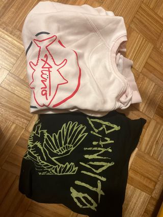 Conjunto de dos sudaderas con diseños gráficos. - Sudadera rosa con logo rojo y negro. - Sudadera negra con estampado verde. - Estilo casual.