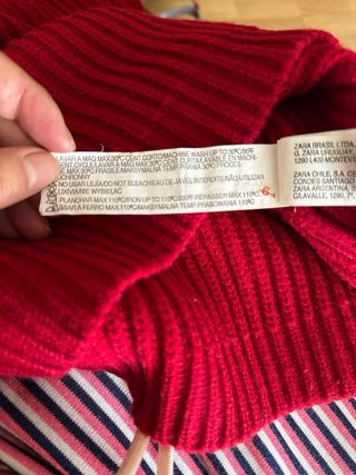 Alegre chaqueta de punto grueso de la marca Bershka, talla 38. Tejido en colores, rojo, amarillo, rosa y verde, con dos originales bolsillos superpuestos delanteros. Adorno etiquetas colegiales. Cierre delantero cremallera. Cuello alto. Mangas con ancho puño con vuelta. Muy abrigadito. Composición: 65% acrílico 20% nylon 15% algodón. medidas: pecho de sisa a sisa 40 cm., largo desde el hombro al bajo 59 cm., manga largo desde sisa 58 cm. bolsillos 17 x 12 cm.