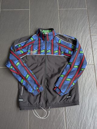 Chaqueta deportiva Puma King con un diseño llamativo y vibrante. - Mangas con estampado de rayas azules, rojas y verdes. - Detalle de la palabra KING repetida en las mangas. - Logo de Puma en el pecho.