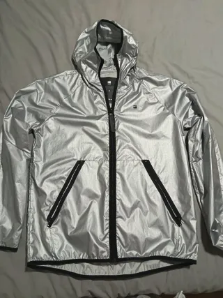 Chubasquero y sudadera con un acabado plateado brillante. La prenda tiene un diseño moderno y funcional. - Capucha ajustable. - Cierre de cremallera. - Tejido ligero y resistente.