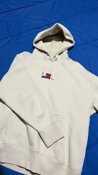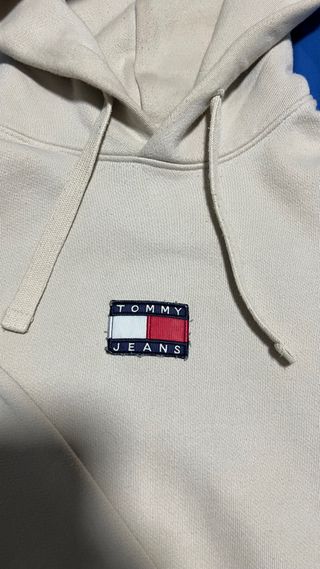 Sudadera con capucha de Tommy Jeans en color beige. Presenta logo en el pecho. Mancha pequeña que se ve en las fotos, lo demás perfecto. - Diseño con capucha y cordones. - Bolsillo frontal tipo canguro. - Puños y bajo elásticos.