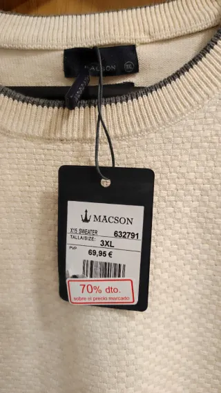 Pack de dos jerseys de entretiempo para hombre, ambos a estrenar, marca Macson y talla 3XL (aproximadamente una 52) Primer jersey color beige en perfecto estado. Segundo jersey en color azul tiene un pequeño enganchón en la parte del pecho como se puede ver en la foto. Es por eso que los rebajo tanto a pesar de su precio y de estar sin estrenar.